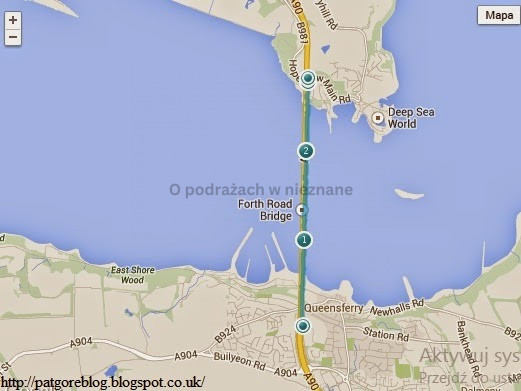 Teraz trochę objaśnień. Queensferry często ma dwie nazwy: South Queensferry i North Queensferry, dla rozróżnienia stron oczywiście. Jest to małe miasteczko w Szkocji liczące sobie około 9400 mieszkańców. Jak widać na zdjęciach można zobaczyć tam dwa mosty, jeden kolejowy, drugi drogowy. Ten drugi można swobodnie przejść, a na ten pierwszy nie ma wstępu.