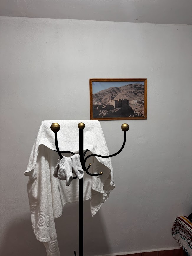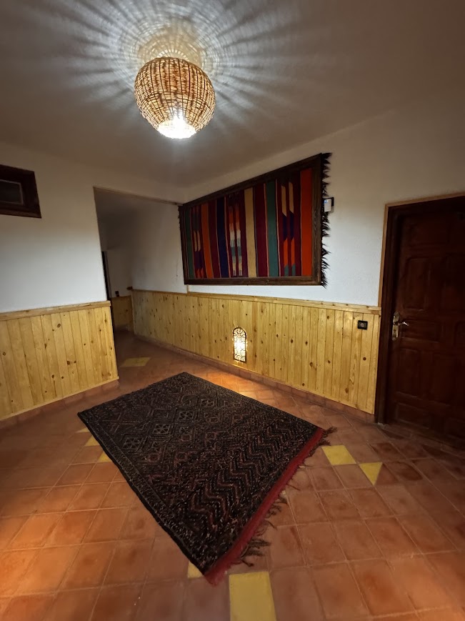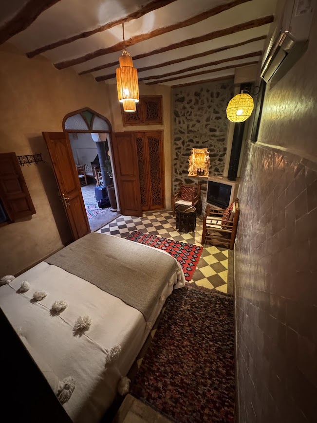 Po 2,5 godzinach pełnych nieoczekiwanych przygód, dotarliśmy wreszcie do hotelu La Gazelle De Dades. Położony w samym sercu natury, blisko rzeki i otoczony spektakularnymi górami, hotel miał absolutnie magiczny charakter. Jego wnętrze wprost emanowało górskim stylem, idealnie komponując się z krajobrazem – drewniane elementy, kamienne ściany i ciepła atmosfera sprawiały, że czuliśmy się jak w górskiej oazie. To miejsce, które naprawdę pasowało do scenerii, jaką oferują góry Dades – surową, ale niesamowicie piękną!